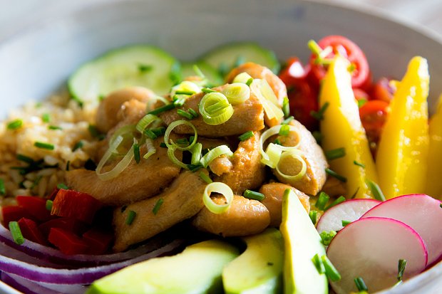 На дно глубокой тарелки выложите рис, а сверху аккуратно разместите все остальные ингредиенты.