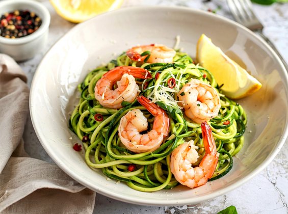 | Кабачковая паста с креветками и чесноком | Креветки, чеснок, сливочное масло, лимонный сок, петрушка | Изысканное блюдо с морепродуктами, которое выглядит и ощущается как ресторанное. |